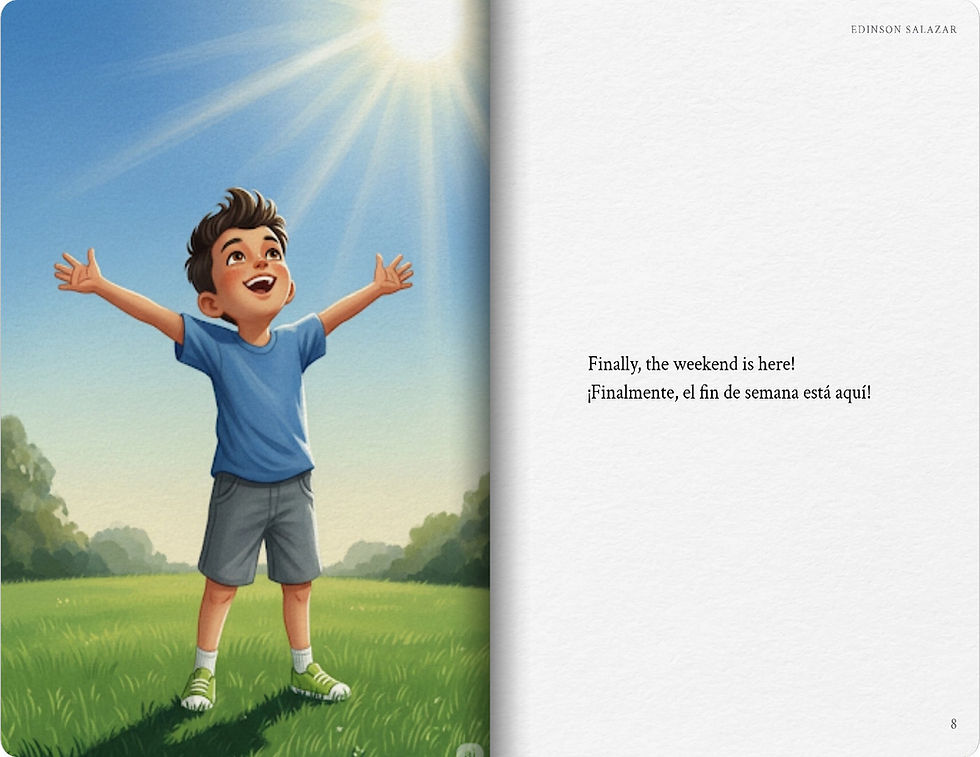 ¡Amo mi rutina! El lunes, voy al gimnasio. El martes y el miércoles, trabajo en la oficina. Mi día favorito es el jueves porque visito a mi abuela. El viernes, veo una película. ¡Finalmente, el fin de semana está aquí! El sábado, juego al fútbol, y el domingo, descanso en casa."